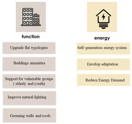 Other research has focused on multiple aspects influencing retrofit strategies in a more comprehensive setting. As shown in [13], which examined the impact of architectural design on energy performance in retrofit solutions, it is essential to connect a building’s energy retrofit with its fundamental architectural principles. Retrofit solutions suggested by [14] applied both active and passive design methodologies in the retrofit of residential buildings for elderly populations, based on user needs and energy benefits. Moreover, retrofitting’s energy and financial components are equally crucial. Assimakopoulos [15] emphasized that volumetric add-on options can maximize comfort while minimizing financial impact. Additionally, Ferrante [16] offered methods for assessing the techno-economic viability of simulating the energy renewal process in residential complexes.