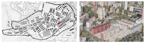 The case study is in Plaza Roja, the neighborhood center where the first urban regeneration programs were implemented in 1994. Social housing apartments face numerous challenges [24]. This block was chosen due to its ample surrounding space for expansion retrofitting, and it also represents the neighborhood’s social housing, changes in family structure, and financial challenges or potential evictions (see Figure 3).