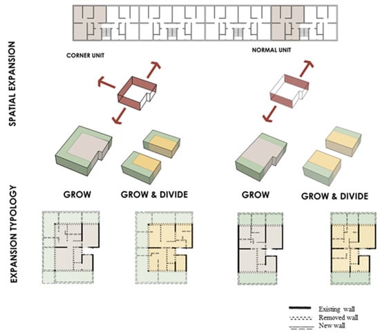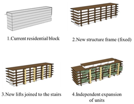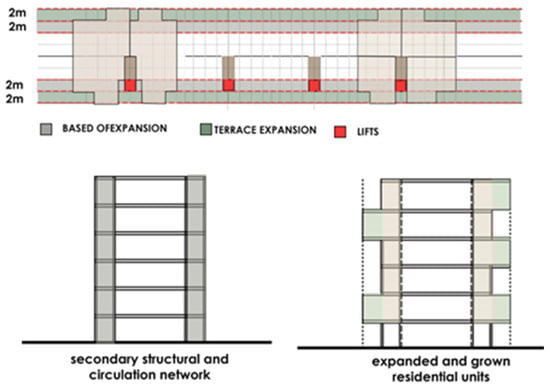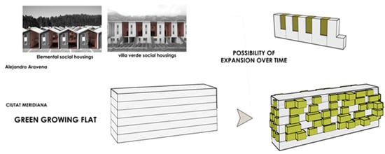 Inspired by this idea, the project focuses on the concept termed Green Growing Units (see Figure 5). This concept is pivotal due to the predominantly low-income demographics of the area, underscoring the significance of enabling household expansion within social housing developments. Consequently, additional fixed structures can be seamlessly integrated into and interconnected with existing buildings, facilitating individual unit extensions and the gradual expansion of homes autonomously. This concept promotes sustainable community development and enhances residents’ well-being. The process involves the following (refer to Figure 6):