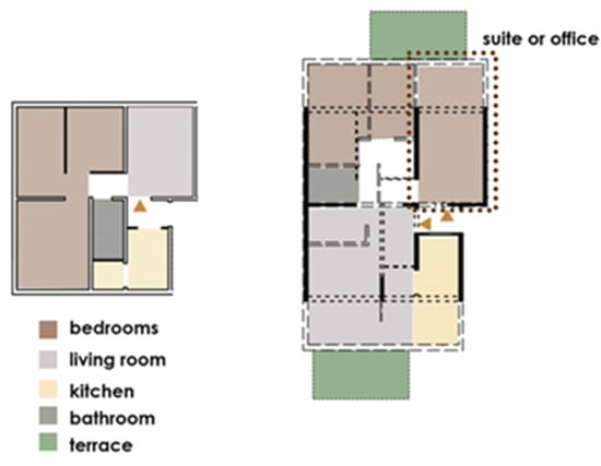 To solve inappropriate spatial arrangements within the unit, adjustments were made to the layout. This included relocating the living room to the south side, adjacent to the kitchen, and connecting it to a sunspace and terrace. The other side of the unit was allocated for the remaining rooms. To enhance the functional flexibility and accommodate demographic changes among residents, separate access was provided to one of the rooms. This room can serve as a home office or a suite suitable for elderly individuals or young couples in a family (see Figure 8).