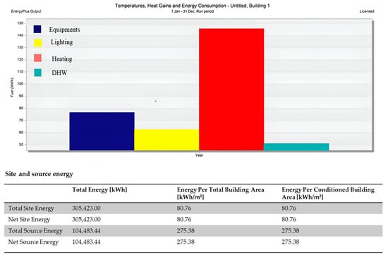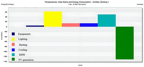 To evaluate the nZEBs target, a retrofit simulation was carried out. Figure 17 and Figure 18 show the yearly energy needs for the main services. The primary energy needed is 112.2 kWh/m2 per year (the total source energy (160.5 kWh/m2) minus the net source energy (48.29 kWh/m2)). Based on the classification of nZEBs in Spain, this result meets the nZEBs target requirements. Specifically, the heating demand decreased by more than 75%, and the total electricity consumption dropped by 43% due to improved indoor conditions and the application of high-efficiency HVAC systems. The lighting demand increased slightly due to volumetric expansion and an increase in the building’s area. The primary energy decreased by 40%, even though two new services, cooling and ventilation, were added compared to the base case.