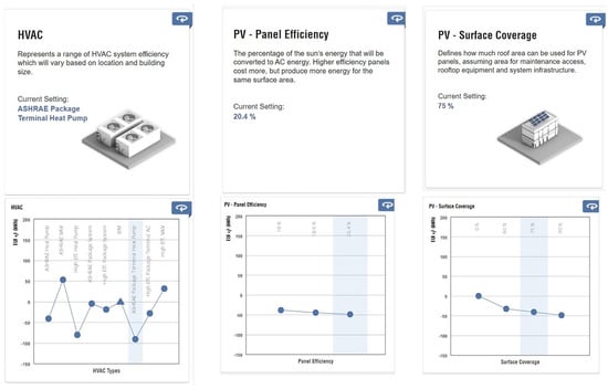 Double-glazed windows with low emissivity (Low-E) and spectrally selected materials were also considered. The roof was also included in the renovation scope to increase the overall energy efficiency (U = 0.0857 W/(m2K). In terms of HVAC systems, Pastore [40] mentioned that heat pumps are the most energy-efficient equipment. Therefore, heat pumps are preferred for heating and cooling to provide year-round comfort. Although installation costs are higher, heat pumps can save money in the long run due to their energy efficiency. Given the characteristics of HVAC systems, it is critical to use photovoltaic systems to provide on-site electricity. A photovoltaic system was chosen for the social housing Ciutat Meridiana due to its reasonable efficiency (15%), reliability, and long lifespan of crystalline silicon cells, which are a cost-effective choice for low-income residential areas, requiring minimal maintenance, primarily periodic cleaning, and occasional inspection to ensure optimal performance. The system’s southeast orientation and 36° tilt optimize solar exposure, enhancing energy production to approximately 135 MWh/year, and significantly offsetting the building’s energy consumption (see Table 3).