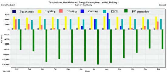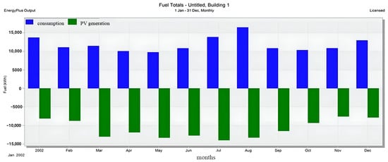 Figure 19 and Figure 20 show that over six months, PV production can satisfy the energy requirement. From March to June, the proposed configuration resulted in a surplus of electricity production that could be transmitted to the grid. During July and September, there was a balance between energy consumption and PV production. However, in the middle of summer and the last three months of the year, the energy needs of buildings exceeded PV production and had to be supplemented by the grid.