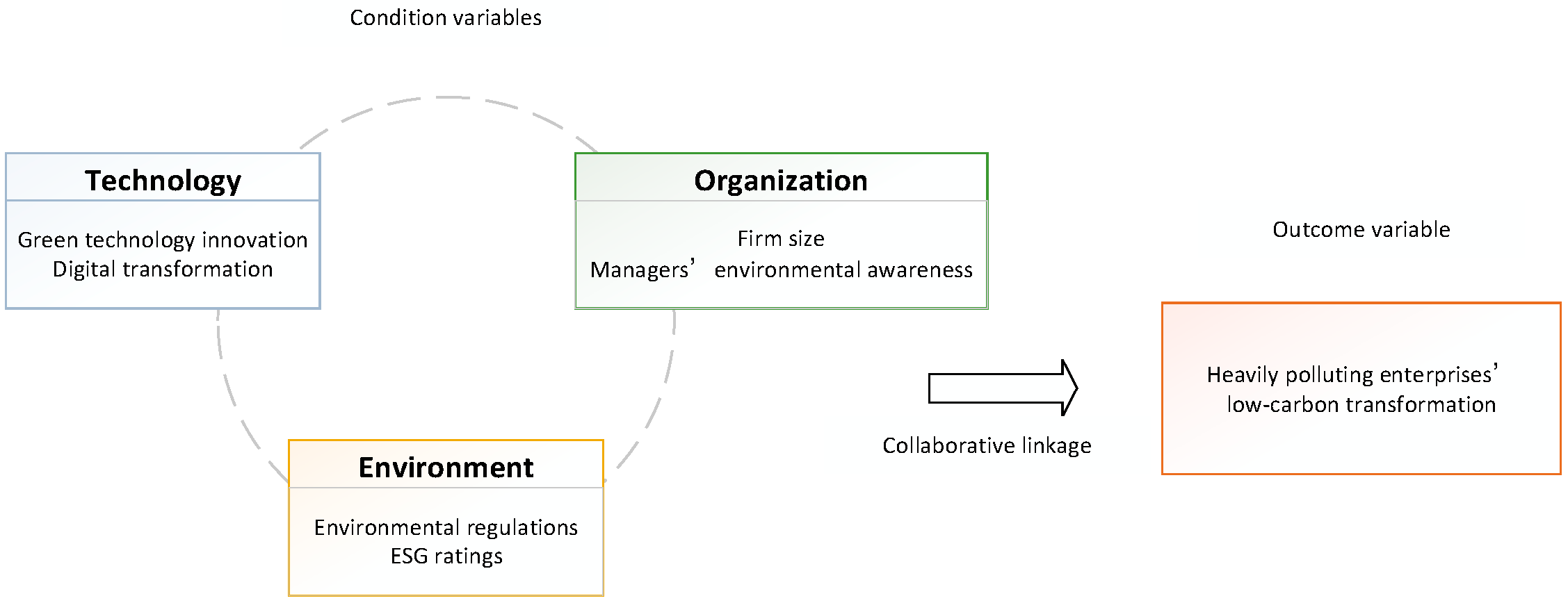 - While most of the existing literature focuses on regional carbon emission reduction, few studies have explored the enterprise level. This paper used the TOE framework to examine heavily polluting enterprises. Taking into account China’s specific context, six secondary conditions that impact the low-carbon transformation of these enterprises were identified, providing a basis for qualitative comparative analysis.