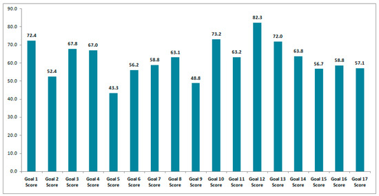 The Arab region as a whole has demonstrated very low performance on almost all SDGs; and most courtiers are not expected to meet most of these goals by the deadline due to several enormous economic, environmental, social, political, and technological challenges. Numerous regional and global reports have prominently revealed that many countries in the region are far off-track to achieve the SDG targets [7,36,37]. For example, recent reports on the Global SDG Index show that many countries did not score high in terms of SDGs performance (see Figure 1, Figure 2 and Figure 3). The slow progress in implementing the SDGs was also emphasized in the 2022 Arab Region SDG Index and Dashboard Report [36]. This report shows that a total of 19 Arab countries have not yet achieved a single SDG. It also reveals that SDG5 (Gender Equality), SDG2 (Zero Hunger) and SDG8 (Decent Work and Economic Growth) are the most significant challenges across the region.