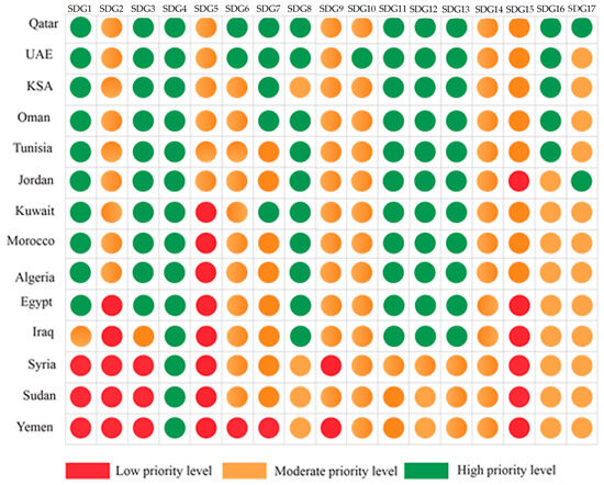 In Figure 4, the visual representation of the SDG priority levels shows that out of the total 238 SDG priority scores calculated for all universities in the sample, 29 (12.2%) fall within the red color range, 117 (49.1%) fall within the orange color range, and 92 (38.6%) fall within the green color range. Moreover, it is clear that the universities from Qatar had the highest number of SDG scores in the green color band (11 SDG scores), followed by universities in the UAE, which had 10 scores in this color range. The results also indicate that four out of five high-income countries and one middle-income country (Tunisia) did not receive any values in the red color range. In contrast, two low-income countries (Sudan and Yemen) and one middle-income country had the highest number of SDG priority scores in the red band (five, eight, and six, respectively). Sudan, Syria, and Yemen only scored one SDG priority score in the green range (SDG4: Quality Education). By utilizing these color ranges, stakeholders can easily differentiae the priority level of each SDG. This visual representation facilitates decision-making processes and resource-allocation strategies, enabling universities and other relevant entities to concentrate their efforts on SDGs that are deemed more important in the Arab region.