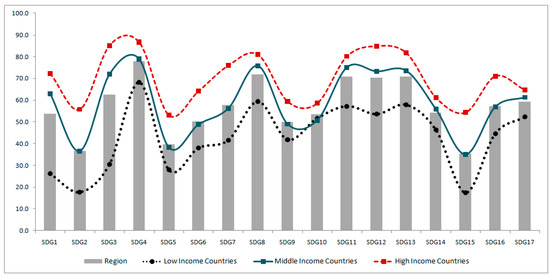 At the sub-regional level, Figure 5 shows that, in general, the SDGs received higher levels of priority among universities in high-income countries (HICs) than among universities in middle-income countries (MICs) and low-income countries (LICs). The mean, minimum, maximum, and standard deviation for the SDG priority score values are as follows: 70.0, 41.2, 89.6, and 12.373 for the HICs; 58.9, 19.2, 84.6, and 16.112 for the MICs; and 43.1, 17.1, 68.6, and 15.112 for the LICs. According to the F-test, there are statistically significant differences between the three sub-regions in terms of the average SDG priority score values for each of the 17 goals.