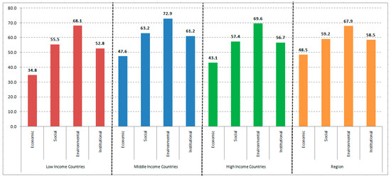 The SDGs prioritization scores according to sustainability dimensions at the regional level.
