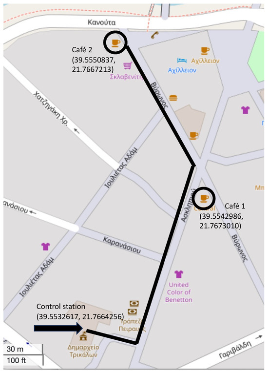 In the pedestrian area in the Trikala city center, a prototype homogeneous fleet of 5 identical Yapes collects coffee residuals from the coffee shops in the area and delivers them to the deport/control station. The length of the round trip is about 4500 m. The delivery path includes Asklipiou Street and Buronos Street; the number of service stops is 2 at the coffee shop locations. In Figure 1, the control station location is indicated by an arrow, the stop locations are displayed with cycles, and the delivery path is displayed with a black line. Figure 1 includes the coordinates of the main stops.