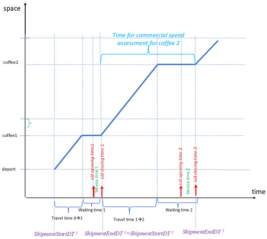 Commercial speed in i + 1: it is given by the rate between the distance between 2 service points (i and i + 1) and the time interval: ShipmentEndDTi+1 − ShipmentStartDTi+1 which, in turn, is given by the sum of travel time between i and i + 1 and the waiting time in i + 1.