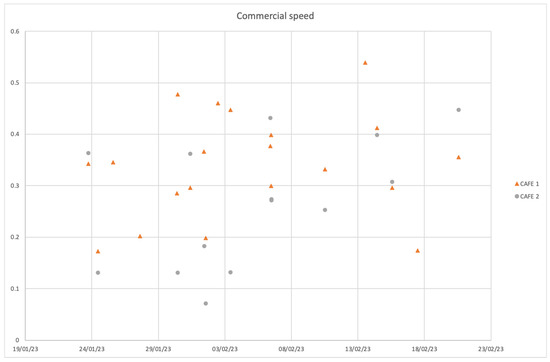 Figure 4 reports the ShipmentStartDT on the x-axis (it refers to the time from 19 January to 23 February 2023) and the related commercial speed [m/s] on the y-axis. Data related to coffee shop 1 are displayed as triangles and those related to coffee shop 2 as circles.