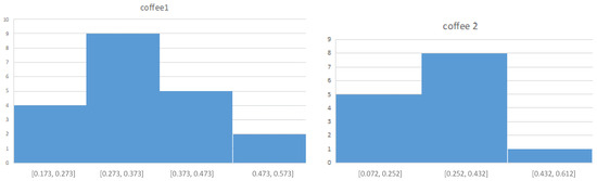 The statistical analysis performed with the Microsoft Excel Analysis Toolpak, version number 16.78.3 (Data/Test analysis: two samples assuming different variances) is reported in Table 1. Since the absolute calculated t-value (1.76) is lower than the critical two-tail value (2.06), there is no statistically significant difference between the means of the coffee shop 1 and coffee shop 2 datasets. In addition, the two-tailed p-value of the test is 0.09, which is higher than the significance level of 0.05, and we can accept the null hypothesis, while we do not have sufficient evidence to say that the two population means are different. Therefore, the two datasets have been analyzed as a unique dataset since we do not have sufficient evidence to say that the two datasets are statistically different. This allows us to have a fairly large database and, therefore, gives greater reliability to the proposed analysis.