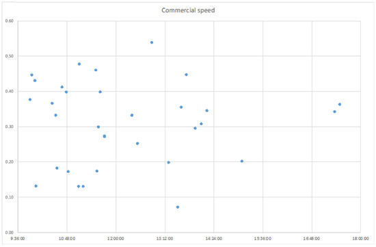 From Figure 8, it is also evident that, in the observed period, commercial speed does not reach a value and then remains constant over time. In fact, throughout the observed period, the commercial speed showed an increasing trend over time. Therefore, a further increase in the commercial speed of droids is possible, extending the experimentation time.