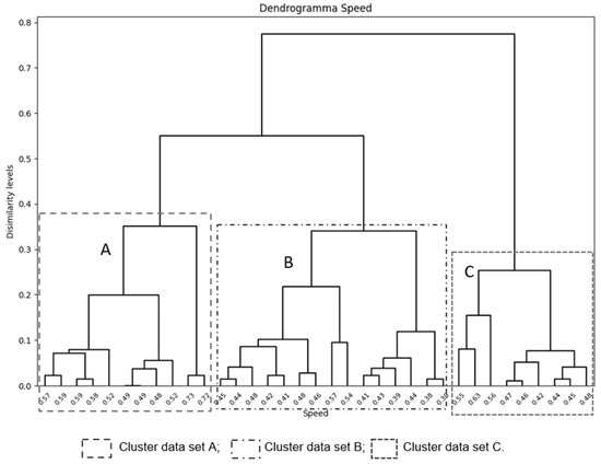 In the dendrogram displayed in Figure 7, the y-axis reports the dissimilarity levels. Distance/dissimilarity is based on commercial speed values. As already said, the elements to be grouped are daily times. The number of items on the x-axis is equal to the number of observations (34). For each observation, a label is placed on the x-axis with an indication of the time of the day to which the observation refers. The time values have been obtained by the Microsoft Excel TIME function that returns a value between 0 and 0.99988426, indicating an hour between 0.00.00 and 23.59.59. Therefore, every 14.4 min, the label value increases by 0.01. Table 3 shows the moments of the day (hours and minutes) in which commercial speed values were recorded and the corresponding values belonging to interval [0, 0.99] obtained with the Excel TIME function and reported on the x-axis in Figure 7.