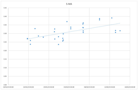 The choice of the order m must consider that as m increases, the size of the new database formed by the averages (m-MA) is reduced, but more reliable trend indicators are obtained that are less subject to temporary fluctuations. Therefore, taking this into account and considering the temporal distribution of these collected data and their stability, an order of 5 was chosen (5-MA). In fact, for stable data, short periods may be sufficient to eliminate short-term fluctuations [32].