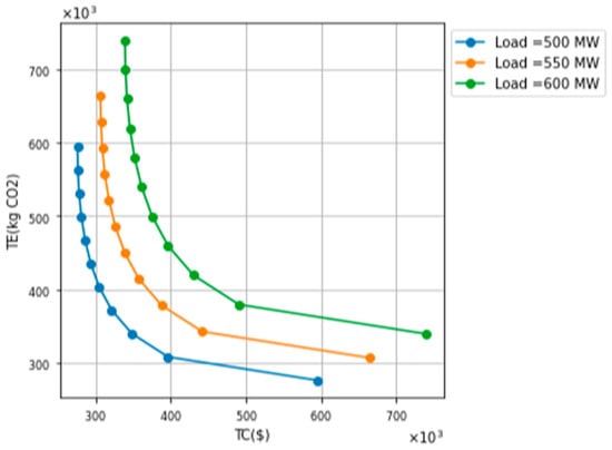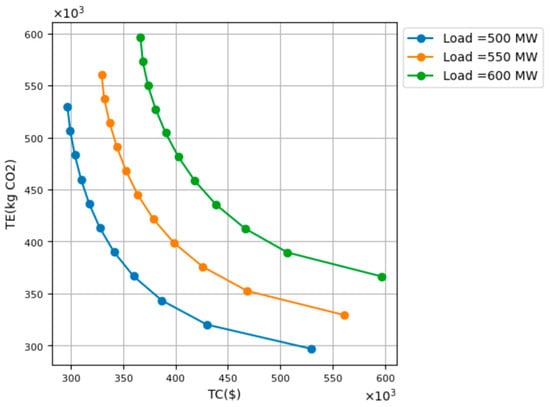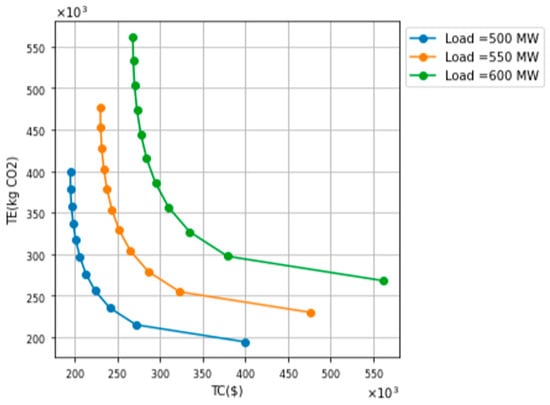 In all figures, it can be observed that as the demand increases (500 MW -> 550 MW -> 600 MW), the corresponding set of optimal solutions is shifted to higher values for both total emissions (TE) and total operational cost (TC), i.e., they are shifted towards the upper-right part of the figure. This is explained by the fact that greater levels of demand require greater generation of power or heat, and result in a greater level of emissions.