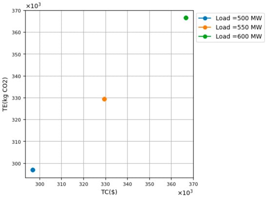 Figure 8 shows that the solution collapses into three points, each corresponding to the three different levels of demand, for the same reasons that apply to the nonlinear cases above (e.g., see study S2). It can therefore be seen that the type of the function (linear/nonlinear) for the operational cost and emissions has no effect when there is a direct relationship between the coefficients of the higher-order terms for cost and emissions.