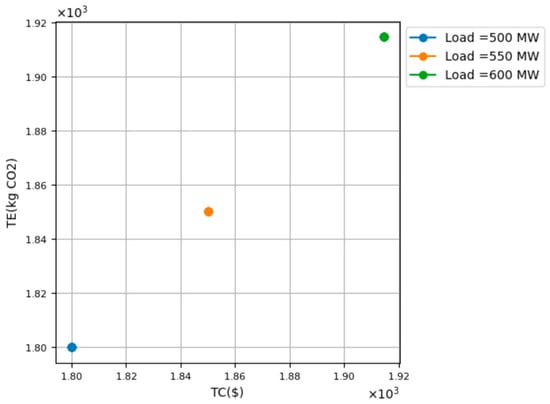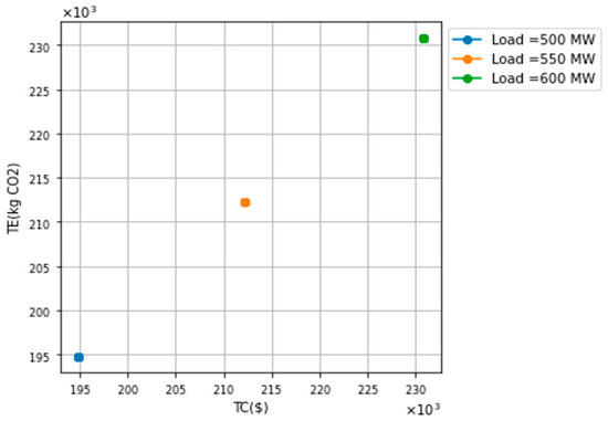 Notice also that for sensitivity studies S1, S3, and S5, a Pareto frontier is obtained as opposed to studies S2, S4 and S6, where the set of solutions is essentially concentrated on one point, each for a level of demand. This has been explained in Table 1 and Table 2 above, i.e., it happens because for studies S1, S3 and S5, the generation units are characterized by an inverse relationship between total emissions and total costs, meaning that the units that are expensive to yield low emissions, whereas the units that are inexpensive to yield a high amount of emissions. In such an energy system, achieving lower levels of total emissions (i.e., moving downwards on the vertical axis) inevitably leads to an increase in total costs (i.e., a rightwards movement on the horizontal axis). And vice versa, achieving lower total costs will inevitably lead to an increase in the resulting CO2 emissions. Therefore, there is a tradeoff according to which it is not possible to improve both objectives of minimizing the cost and the CO2 emissions at the same time.