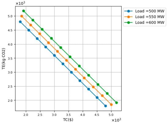 Regarding Figure 7 and Figure 8 below, these correspond to studies S7 and S8, respectively. In Figure 7, it can be observed that the Pareto optimal frontier is no longer nonlinear but has a straight line. This is because in this case, both objective functions (cost minimization and emission minimization) are linear since the coefficients of the quadratic terms are both zero. For this reason, the resulting Pareto frontier has a linear shape as opposed to cases S1, S3 and S5 above, where the frontier has a nonlinear shape since the coefficients of the quadratic terms are both non-zero.