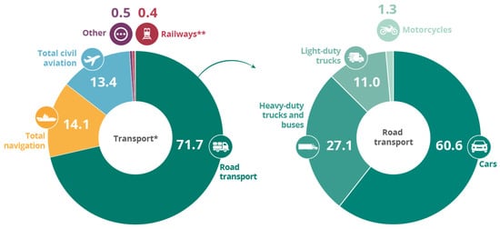 The transportation sector, accounting for 23% of global emissions, ranks high among the main contributors to global warming []. According to the European Environment Agency, in 2022 cars (i.e., passenger vehicles) accounted for 60.6% of the carbon emissions related to road transportation (see Figure 1). Thus, decarbonizing the transportation sector can be considered an essential and significant step to achieve our energy transition [] objectives.