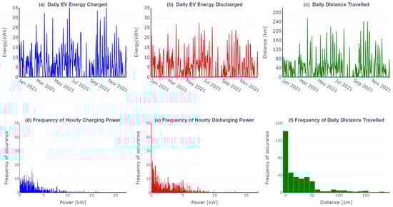 Daily usage summary of EV: (a) energy charged, (b) energy discharged, and (c) distance traveled. Distribution of EV data: (d) frequency of power at which EV was charged, (e) frequency of power at which EV was discharged and, (f) frequency of hourly distance covered by EV (data source: []).