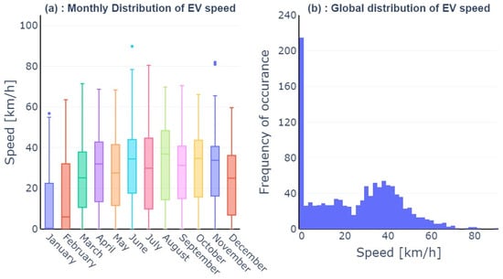 Statistical distribution of vehicle speed: (a) monthly distribution and (b) annual distribution (data source: []).