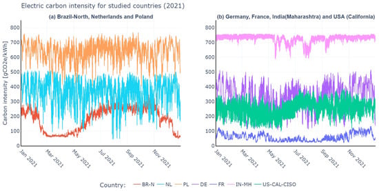 Hourly carbon intensity for the electricity grids of (a) Northern Brazil, the Netherlands, Poland, (b) Germany, France, India (Maharashtra), and the USA (California) (data source: []).