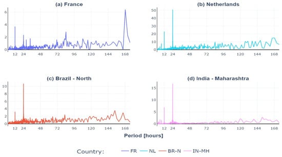 Results of the Fast Fourier Transform applied to carbon intensity in hours for (a) France, (b) the Netherlands, (c) California (USA), and (d) India (data source: []).