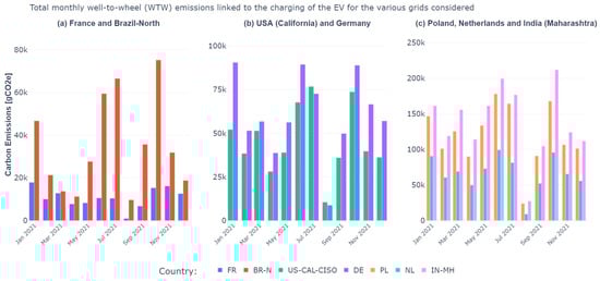 Total monthly WTW (indirect) emissions resulting from the charging of the EV (derived from historical data) for (a) France and Northern Brazil, (b) the USA (California) and Germany, and (c) Poland, the Netherlands, and India (Maharashtra).