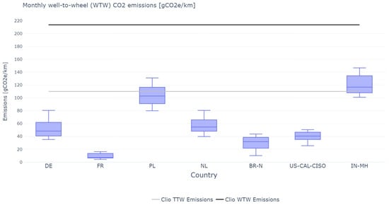 Variation in the average monthly WTW (gCO2e/km) emissions in the selected countries.