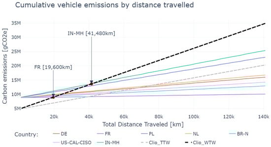 To study the balance between embodied and operational emissions, Figure 10 shows the cumulative emission of greenhouse gasses (in CO2 equivalent) throughout the vehicle’s life cycle. The markings in red highlight the intersection between the cumulative WTW emissions of the Renault ZOE in different grids and that of the reference ICE vehicle (i.e., the Renault Clio). Thus, these intersections represent the point at which the EV’s life cycle emissions equalize those of the ICE’s, or how many kilometers the studied EV would need to travel given the grid’s carbon intensity to pay back its extra 50–100% embodied carbon emissions.