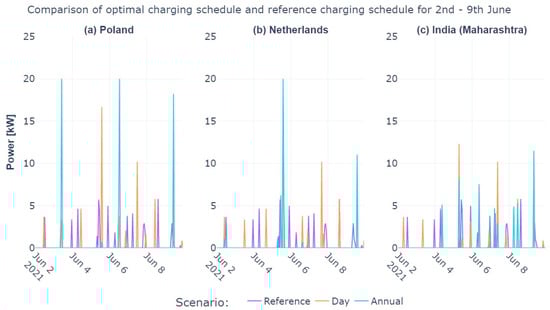 Comparison of one week’s optimal and reference charging schedules for (a) Poland, (b) the Netherlands, and (c) India (Maharashtra).