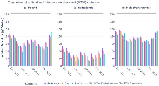 Comparison of monthly reference indirect EV emissions against optimal WTW emissions for (a) Poland, (b) the Netherlands, and (c) India (Maharashtra).