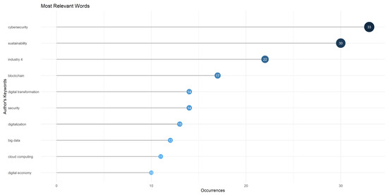 Regarding the most frequently used terms, Figure 3 highlights the term “cybersecurity”, which appears 33 times, indicating a predominant focus on digital systems and data security in sustainable development. This is followed by “Sustainability”, which has 30 mentions, emphasizing the recognition of its importance in ensuring the protection of digital resources over the long term. The term “Industry 4.0” appears 22 times, reflecting the role of the industrial sector in implementing safe and sustainable practices in its digital infrastructure and operations. Other notable terms include “Blockchain” (17 mentions), “Digital transformation” and “Security” (14 mentions each), “Digitalization” (13 mentions), “Big data” (12 mentions), “Cloud Computing” (11 mentions), and “Digital economy” (10 mentions). These frequencies underscore the emphasis on digital innovation and security aspects within sustainable development”.