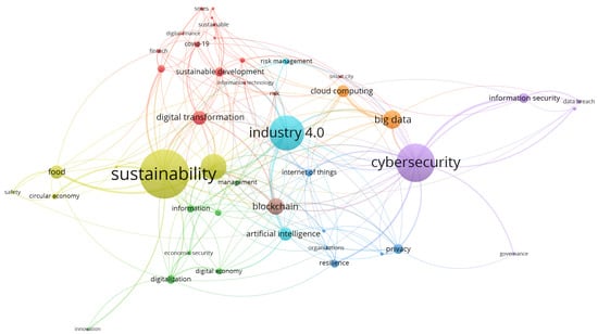 The term “Sustainability”, prominently featured, underscores its central importance in the network, connecting various concepts such as “digital transformation”, “blockchain”, and “Industry 4.0”. This highlights the transformative role of digital and technological advancements in achieving sustainable goals. The frequent mention of “Industry 4.0” reflects its significance in modernizing industrial processes through digitalization, where cybersecurity is essential to prevent interruptions and ensure the security of connected systems.