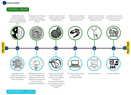 A teaching sequence was designed with the aim of promoting geology and paleontology literacy in relation to sustainability issues. The sequence consisted of eight sessions, lasting fifty minutes each (Figure 1). The first session involved both the control and the experimental groups completing pre-test questionnaires to establish baseline knowledge. The second session featured a master class on deep time for the control group, while the experimental group prepared for a scientific congress on Earth’s history and environmental issues. Subsequent sessions alternated between master classes for the control group on geological epochs and corresponding activities for the experimental group, including research, poster creation, and oral presentations.