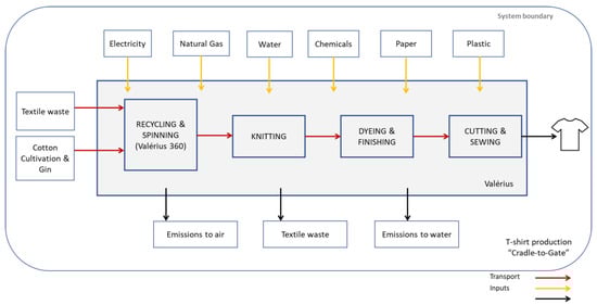 To better understand the limitations and the best way to harmonize criteria to benchmark environmental impacts on textile products, this study will cover a case study in Portugal that uses the “cradle-to-gate” approach to analyze the impacts of a T-shirt made with recycled cotton combined with organic cotton and compare it with another T-shirt made just with organic cotton or conventional cotton. It is based on the primary data gently shared by the Portuguese company Valérius [], a facility able to convert cotton textile waste into new yarn after being transformed into new jersey fabrics, finally used to produce more conscious garments. This Portuguese textile company handles the final garment manufacturing process and has close partnerships with knitting and dyeing houses. Its recycling process can obtain, through a mechanical process, high-quality recycled cotton fibers with a 20 mm length, although, as usual [], they need to be blended with other virgin fibers to expand strength and durability. Organic cotton is one of the virgin fibers frequently used and will be considered in this study. Although the recycling process is thorough, some recycled fibers are too small and cannot be used in a textile context, so the company has added another site to use them for the production of paper.