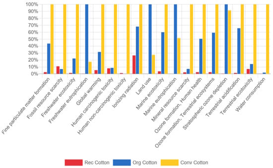 Environmental impacts were recalculated using the EF method (adapted) based on EF method 2.0 to enable normalization. This is the impact assessment method of the environmental footprint initiative, which considers 16 environmental categories that can be aggregated into a single score. The normalization was performed by applying the normalization factors (NF) of the JRC Technical Report 2017 [] as presented in Figure 8. No weighting was considered for the calculation of a single score per T-shirt or comparison with the reference T-shirt on PEFC (PEF-RP).