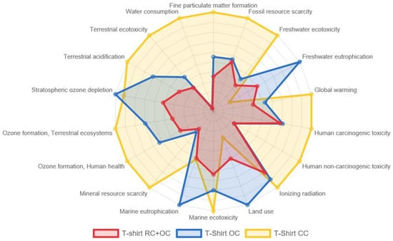 The environmental impact of one T-shirt was calculated considering the weight of 200 g per T-shirt and is summarized in Figure 9.