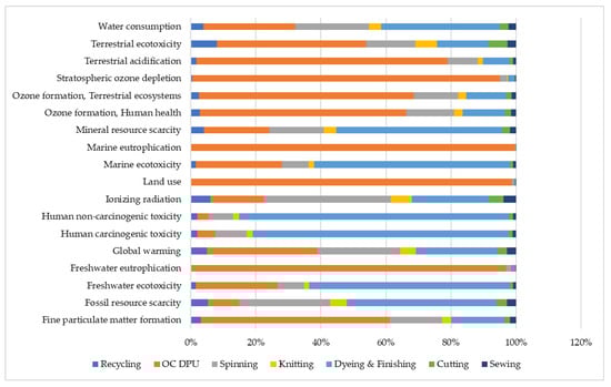 Moreover, only one study dealing with recycling cotton yarn was identified [] in the context of Zhejiang province in China. It considers raw material acquisition, transportation, breaking, mixing, and spinning. The life cycle of virgin cotton yarn production was divided into raw material acquisition, transportation, mixing, and spinning. The distance between the cotton cultivation origin in Xinjiang province and the factory in Zhejiang province is assumed to be 4650 km by truck. The average distance between the factory of yarn manufacturers and the enterprises located in the local or nearby cities engaged in the recovery of waste clothes is assumed to be 100 km by truck. Both pathways obtain 1000 kg of yarn. Climate change, fossil depletion, water depletion, and human toxicity environmental impact categories were analyzed using GaBi proprietary software and ReCipe midpoint (H) impact assessment. Climate change retrieved 11 kg CO2 eq/kg virgin conventional cotton yarn and 4.38 kg CO2 eq/kg recycled yarn. Water depletion is retrieving 3514 m3 of virgin yarn and 583 m3 of recycled yarn.