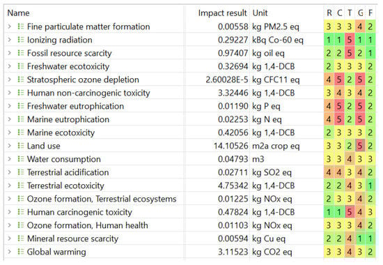The ReCipe 2016 mid-point (H) was used as the impact assessment method, converting emissions and resources used in the product life cycle into 18 environmental impact categories/indicators. These categories include fine particulate matter formation (kg PM2.5 eq); fossil resource scarcity (kg oil eq); freshwater ecotoxicity (kg 1,4-DCB eq); Freshwater eutrophication (kg P eq); global warming (kg CO2 eq); human carcinogenic toxicity (kg 1,4-DCB eq); human non-carcinogenic toxicity (kg 1,4-DCB eq); ionizing radiation (kBq Co-60 eq); land use (m2a crop eq); marine ecotoxicity (kg 1,4-DCB eq); marine eutrophication (kg N eq); mineral resource scarcity (kg Cu eq); ozone formation, human health (kg NOx eq); ozone formation, terrestrial ecosystems (kg NOx eq); stratospheric ozone depletion (kg CFC11 eq); terrestrial acidification (kg SO2 eq); terrestrial ecotoxicity (kg 1,4-DCB eq) and water consumption (m3). This method is frequently used in this scope and considers the hierarchist (H) perspective, which is based on the scientific consensus about the time frame (100 years) and plausibility of impact mechanisms []. No allocation method was considered.