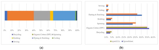 (a) Percentage of GWP100 impact per type per flow; (b) percentage of GWP100 impact per type per process and comparison of the spreadsheet and openLCA results. Organic cotton (DPU) represents the impact generated by organic lint cultivation, ginning, and transportation from Turkey to a recycling facility.
