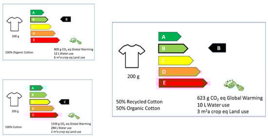 The proposed “Envi-Score” (A to E) is derived from the Nutri-Score, the nutritional rating system recommended by the European Commission to showcase the overall nutritional value of food products that are well-recognized by consumers and widely adopted by retailers. It comprises five color categories (green, light green, yellow, orange, and red), correlating with the letters A (best) and E (worst), respectively. This scale aims to illustrate the environmental performance of products, facilitating quick and easy interpretation. By assigning an environmental score to each product, encompassing all environmental impacts into a single key performance indicator (KPI), consumer decision-making is simplified while also offering a comparison with a reference (PEF-RP, in this case). In this system, both T-shirts with 50% recycled cotton and 100% organic cotton achieved a B grade, while 100% conventional cotton T-shirts only got a C grade, showing lower overall environmental performance.