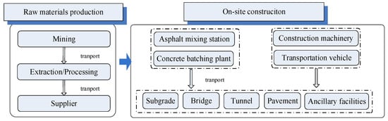 Global climate change has emerged as one of the most pressing environmental challenges in recent years. Greenhouse gases (GHGs) are one of the primary drivers of global climate change. Specifically, carbon dioxide (CO2) is a main contributor. Atmospheric carbon dioxide concentrations have increased by more than 40 percent since pre-industrial times [1]. Considerable CO2 emissions result from energy and resource consumption during various anthropogenic activities, including construction activities. Road infrastructure construction processes are highly carbon-intensive and energy-demanding [2]. Emissions from road infrastructure, including material production and transportation, road construction, maintenance, and road recycling, make up to 5–25% of total CO2 emissions from transport [3], but the contributions from the maintenance and recycling of roads are relatively low [4]. Meanwhile, numerous roads are being constructed worldwide. In China, the national highway network and ordinary national highway network are expected to reach 460,000 km, and the national expressway network is expected to reach 160,000 km by 2035 [5]. Accordingly, the road sector has a very high carbon emission migration potential. Hence, it is critical to elucidate the carbon emissions associated with road infrastructures and thus recognize the opportunities to mitigate these emissions.