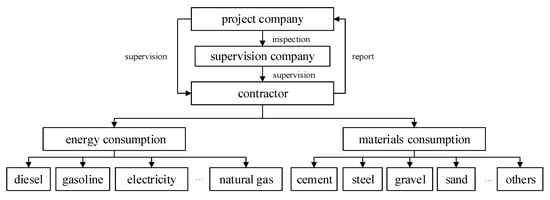 The application of the binary statistical method necessitates the incorporation of a multilevel data examination and verification system to ensure the quality of statistical data (Figure 2). The construction contractor conducts self-inspections based on the monthly statistics table on energy consumption and material consumption. Likewise, the supervision unit reviews the construction machinery account and energy purchase invoices, and the company responsible for the project and relevant technical units examines the statistical data reported by the contractor.