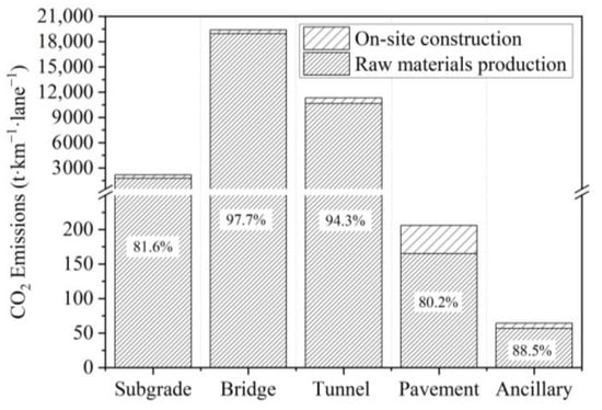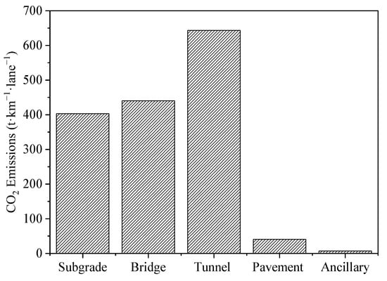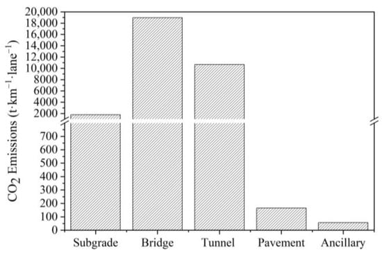 Emissions from the material production phase are mainly derived from the extraction, manufacture, and production of raw materials. The material consumption data obtained from the binary statistical system was calculated from Equation (2). The CO2 emissions in the raw material production phase were 4.91 Mt, and the functional unit emissions were 10,098.2 t·km−1·lane−1. As depicted in Figure 3, the CO2 emissions associated with the construction of the subgrade, bridge, tunnel, and pavement ranged from 165.20 to 18,956.83 t·km−1·lane−1 and were much greater than those of the ancillary facilities, with a value of 56.95 t·km−1·lane−1. The CO2 emissions of the bridges and tunnels were the largest contributors (18,956.83 and 10,666.33 t·km−1·lane−1, respectively), followed by the subgrade with a value of 1785.61 t·km−1·lane−1, and that of the pavement was very low (165.20 t·km−1·lane−1). This was attributed to bridges and tunnels, as highway engineering structures that require extensive engineering and consume large amounts of concrete and steel compared to subgrade and pavement.