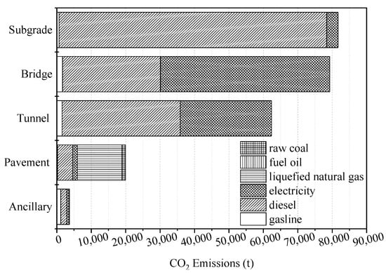Material production accounted for absolute emissions (95.2%), whereas emissions generated from the on-site construction phase were a minor component, only accounting for 4.8%. Generally, the proportion of CO2 emissions in the raw material production phase depends on the type of engineering. The proportions of CO2 emissions in the raw material production phase for bridge and tunnel engineering reached 97.7% and 94.3%, respectively, which were higher than those of the subgrade (81.6%), pavement (80.2%), and ancillary facilities (88.5%) (Figure 9). Therefore, the focus of CO2 emission reduction for road infrastructures should be on the use of materials. Moreover, to lower CO2 emissions further, energy-saving measures should also be adopted in the on-site construction phase.