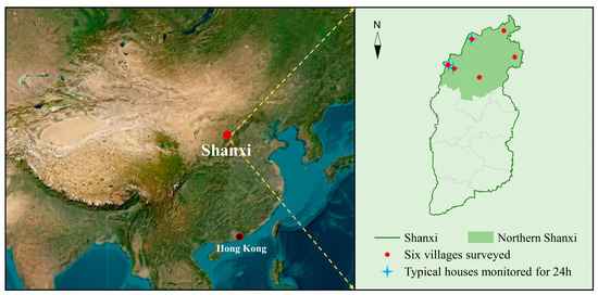 Six villages in northern Shanxi were randomly selected for the questionnaire survey. Their geographic locations are shown in Figure 1. A list of households and heating methods was obtained from village committees. The total sample size was allocated proportionally to the six villages based on the number of households with each heating method in each village. The names of the villages and the number of allocations are shown in Table 1. Finally, 100 households with each heating method were selected using simple random sampling, and a total of 300 questionnaires were distributed. Before filling in the questionnaire, the researcher explained the questions in the questionnaire in detail to the residents and assisted them in interpreting the questions correctly. The age range of the participants was 19–55 years old, with a male-to-female ratio of 1:1.04. Questionnaires with smokers in the surveyed households were invalid and the rest were valid. A total of 286 valid questionnaires were returned. Among them, 94 questionnaires were valid for coal-fired boiler radiator heating, 97 questionnaires were valid for air-source heat pump radiator heating, and 95 questionnaires were valid for Chinese stove–kang heating.