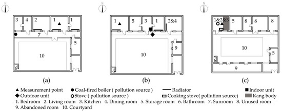 Plans of typical houses monitored for 24 h: (a) coal-fired boiler radiator heating, (b) air-source heat pump radiator heating, and (c) Chinese stove–kang heating.