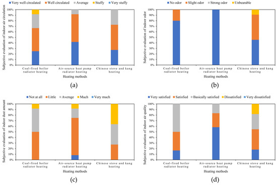 The results of the subjective research are as follows. In terms of indoor air circulation conditions, air-source heat pump radiator heating was the best and the remaining two heating methods had a relatively large proportion of “average” or “stuffy” (Figure 4a). As for indoor odor, residents using air-source heat pump radiator heating felt that there was no odor in the room. For the residents using Chinese stove–kang heating, about 9% found the indoor odor unbearable and about 45% found the indoor odor slight. In addition, 20–30% of the residents using coal-fired boiler radiator heating found the indoor odor slight (Figure 4b). In terms of indoor dust amount, the air-source heat pump radiator heating had the largest proportion of “not at all” or “little”, while the Chinese stove–kang heating had the largest proportion of “much” (Figure 4c). As for overall satisfaction with indoor air quality, about 18% of the residents using Chinese stove–kang heating were “dissatisfied”, while residents using the other two heating methods were all “very satisfied”, “satisfied” or “basically satisfied” with their indoor air quality (Figure 4d). Taken together, the residents’ subjective perception of indoor air quality was that the air-source heat pump radiator heating was the best, followed by the coal-fired boiler radiator heating, while the Chinese stove–kang heating was the worst.